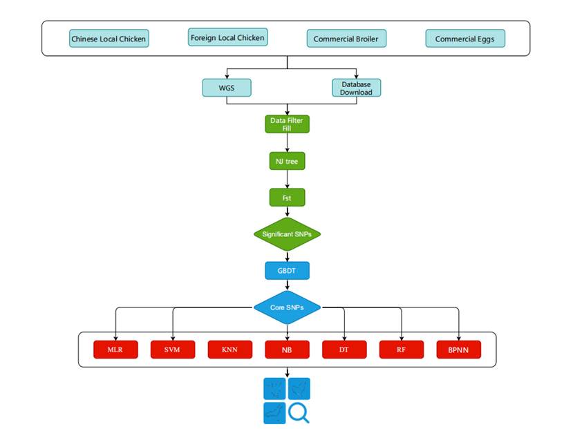 该研究整合了基因组单核苷酸多态性(SNP)变异信息和多种机器学习算法,对来自 132 个鸡遗传资源的 3,798 个个体的全基因组重测序数据和 600 K 芯片数据进行了分析。通过构建最大似然系统发育树去除异常样本,最终保留了 127个品种的数据。利用遗传分化指数评估遗传分化程度,并从每个遗传资源中筛选出遗传分化指数最高的100个SNP位点,采用梯度提升树模型评估这些位点的重要性。通过比较7种不同机器学习模型的性能,确定最有效的机器学习模型。